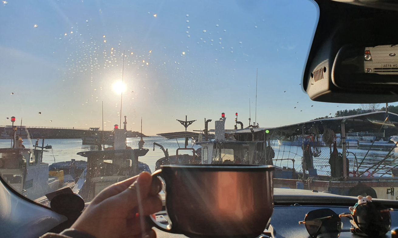 잠깐 차를 움직여서 근처 항구로 가서 따듯한 차 한잔 차안에서 마시고 근처 에서 막국수 먹고 차박을 잘 마무리 하였습니다.