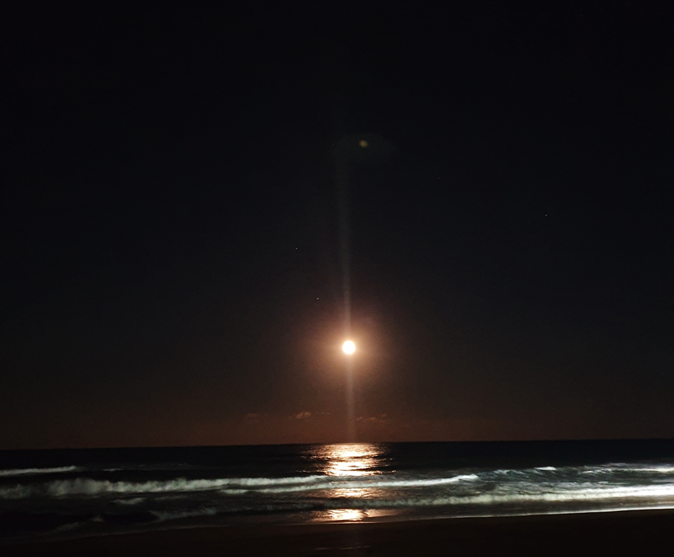 겨울이다 보니 일찍 어두워지고 밤이 되었는데요. 오늘따라 달이 동그랗게 크게 보입니다. 바닷가에 비추어진 달빛이 정말 밝죠? 사진이라서가 아니라 실제로 저렇게 밝았어요. 저희는 이 뷰를 보면서 차안에서 컵라면 딱 먹고 영화 한편 보고 이제 잘 준비를 합니다.