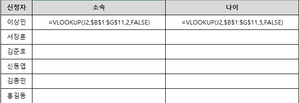 =VLOOKUP(매칭 기준값, 가져올 원본 데이터 영역, 원본 데이터 영역에서 매칭 기준값의 컬럼 순서, 형태)